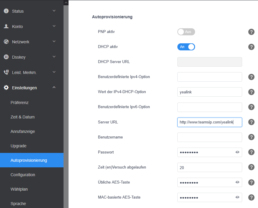 Settings-> Rechts Reiter Automatische Einrichtung -> URL: Server eintragen, z. B. https://www.teamsip.com/yealink -> Bestätigen -> Sofortiges Autoprovisioning Start